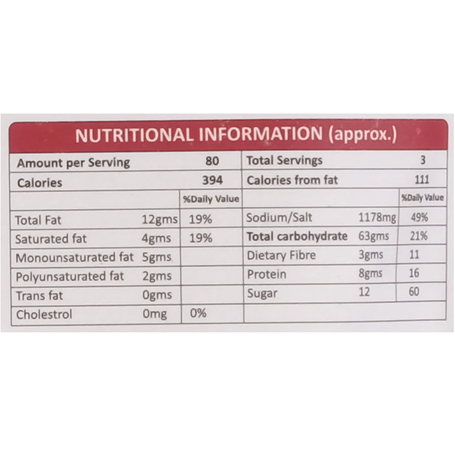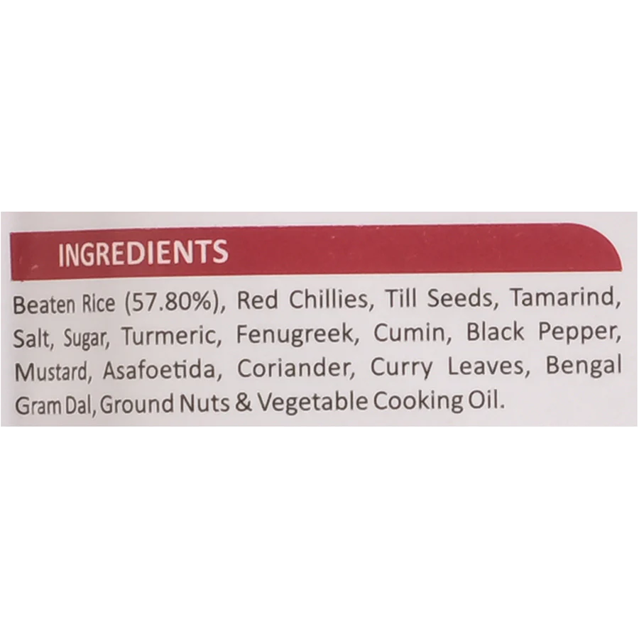 Beaten Rice, Red Chillies, Till Seeds, Tamarind, Salt, Sugar, Turmeric, Fenugreek, Cumin, Black Pepper, Mustard, Asofoetida, Coriander, Curry Leaves, Bengal Gram Dal, Ground Nuts, and Vegetable Cooking Oil