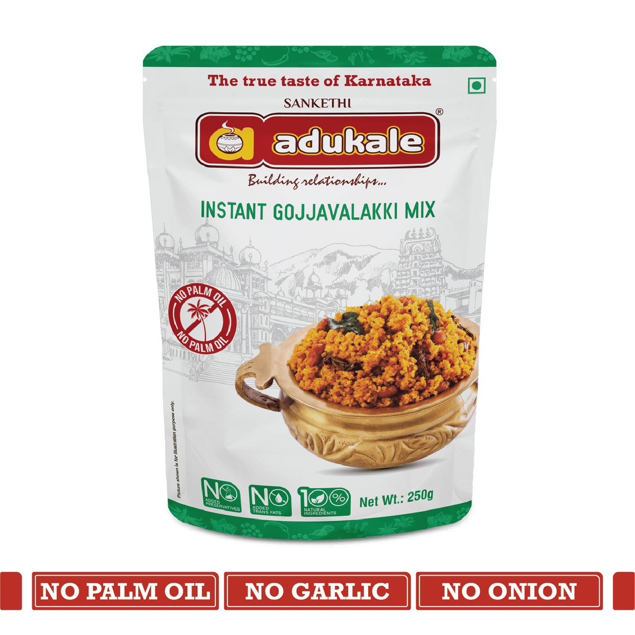 Gojjavalakki/Gojju Avalakki (Kannada: gojju – tangy sauce made of tamarind, avalakki – flattened rice) is a snack that can be prepared very easily either for breakfast or as an evening snack. It is tempered, as is traditional, with mustard and dals. Enjoy this lip-smackingly sweet, tangy, spicy and crunchy dish with Adukale’s Gojjavalkki Mix. Serve with curd for a yummy breakfast.
