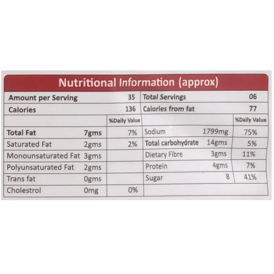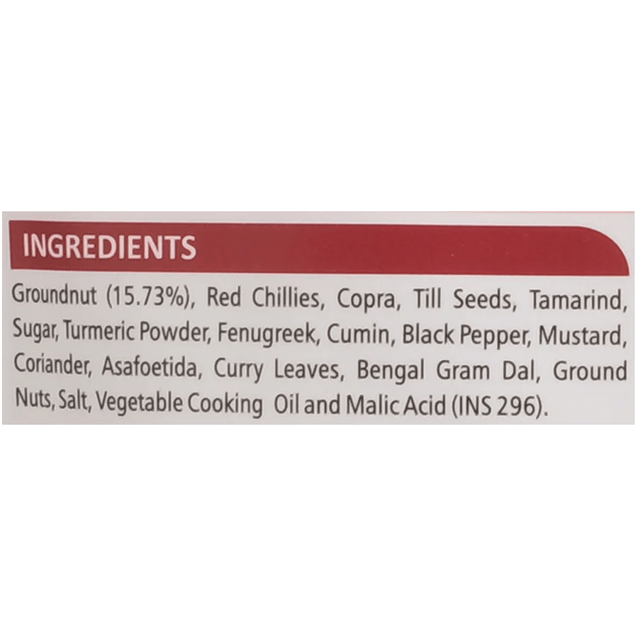 Red Chillies, Copra, Till Seeds, Tamarind, Sugar, Turmeric, Fenugreek, Cumin, Black Pepper, Mustard, Coriander, Asofoetida, Curry Leaves, Bengal Gram Dal, Ground Nuts, Salt, Vegetable Cooking Oil, and Malic Acid